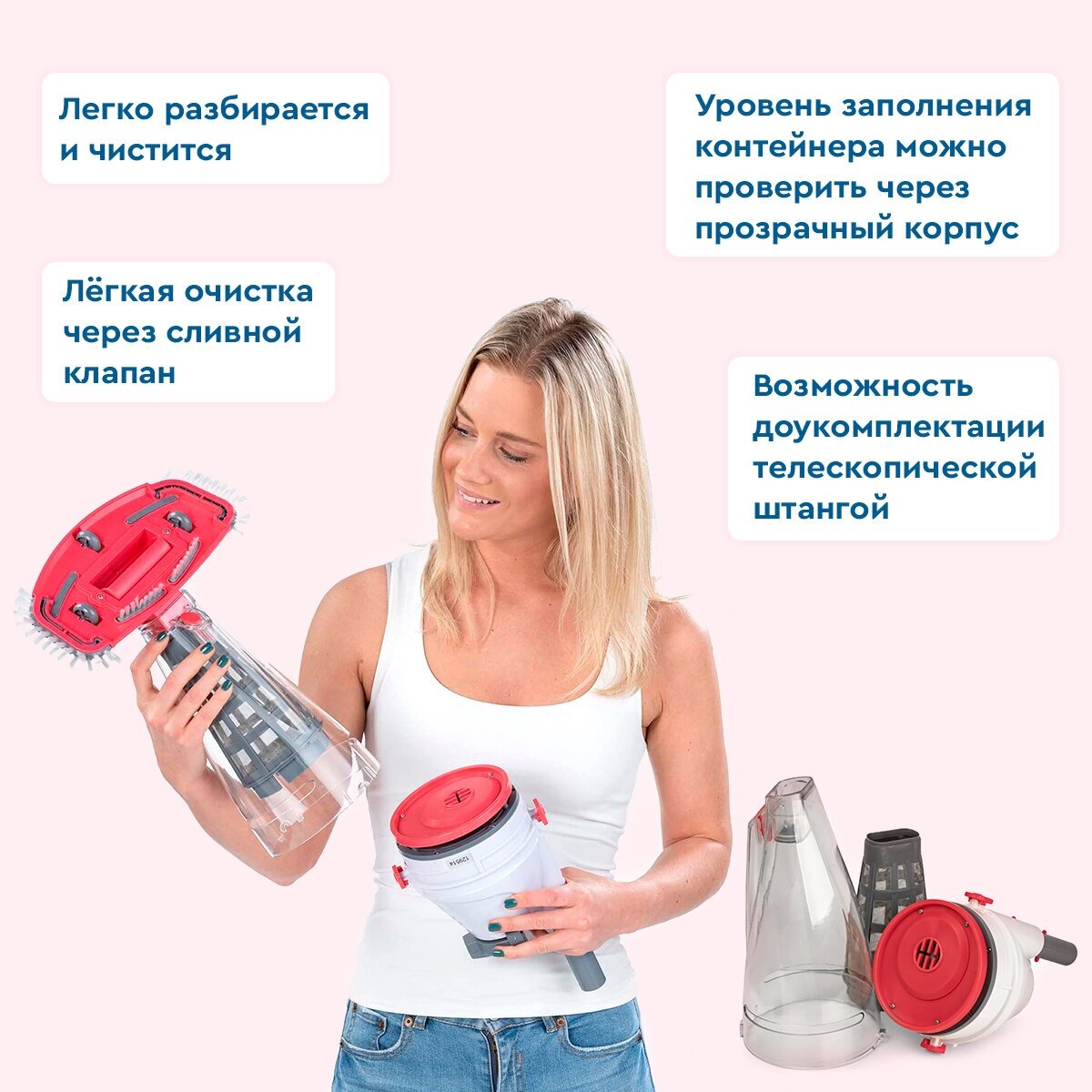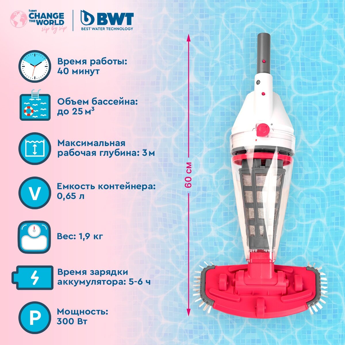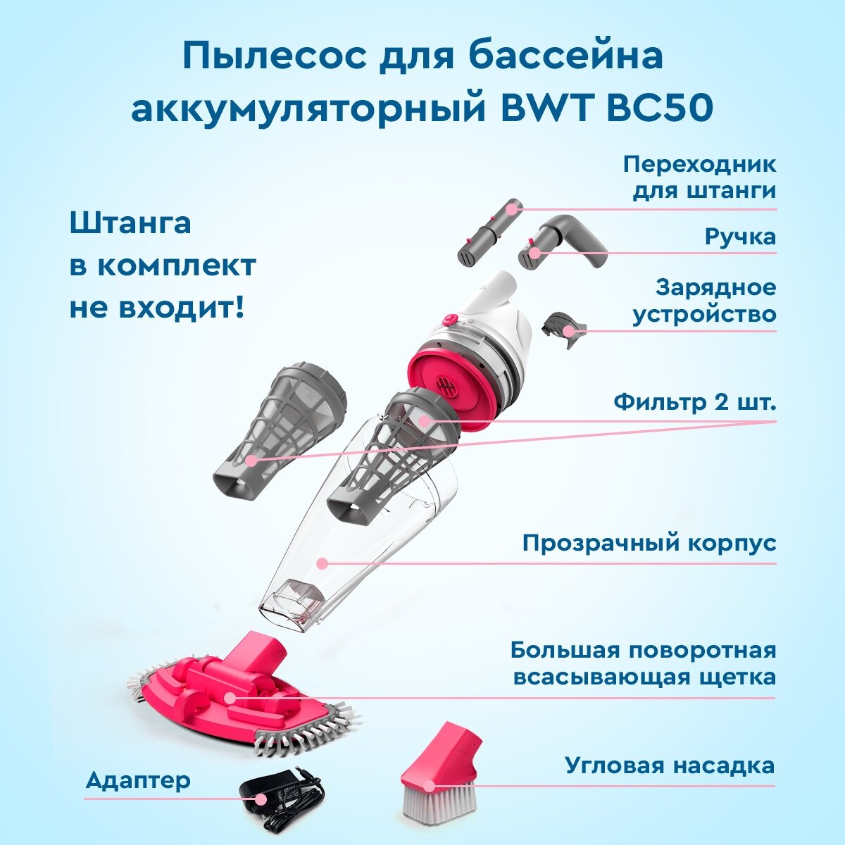 1. Rechargeable pool vacuum cleaner 2. Large rotating suction brush 3. Angle nozzle 4. Filter 2 pcs. 5. Adapter for rod 6. Handle 7. Adapter 8. Charger 9. Instructions in Russian