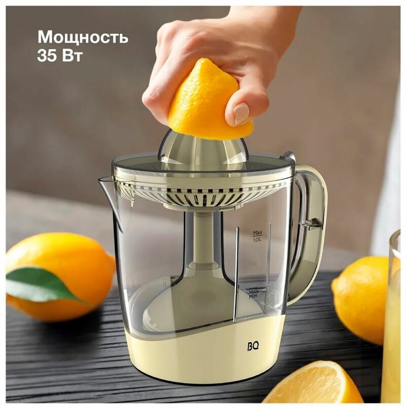 Type: for citrus fruits, power: 35 W, juice tank volume: 1 l, number of speeds: 1, body material: plastic, features: overload protection, design features: rubberized feet