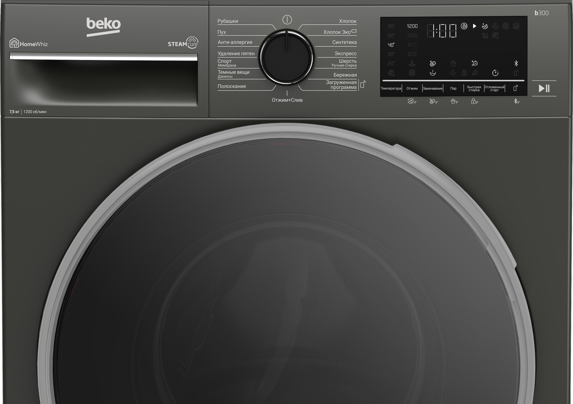 Automatic detergent dosage, spin speed selection, balance control, delayed start, drum cleaning, end of wash signal