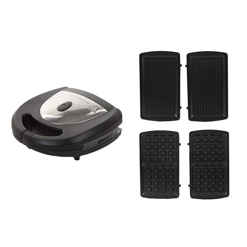 Type: appliance with interchangeable panels, panel type: waffles, grill, sandwiches, waffle panel type: Belgian, power: 790 W, features: non-stick coating, possibility of changing panels, overheating protection, work indicator