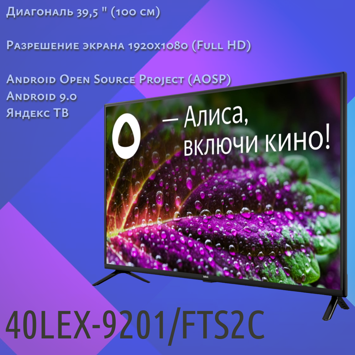 Diagonal: 40"-45", diagonal exactly: 40", HD resolution: Full HD, screen refresh rate: 60 Hz, screen technology: LED, Digital TV support: DVB-C, DVB-S2, DVB-T2, analogue PAL , SECAM, NTSC, Smart TV platform: YaOS, wireless communications: Bluetooth, Wi-Fi