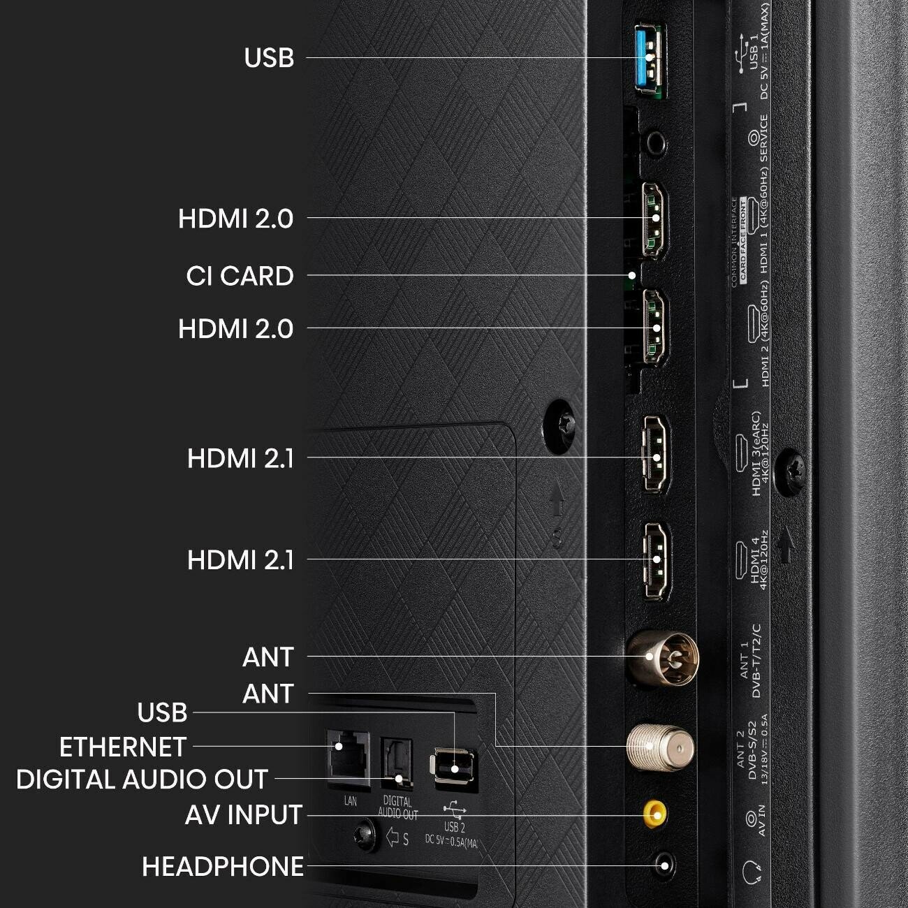 Ethernet - RJ-45, USB Type-A, HDMI input x 4, headphone output