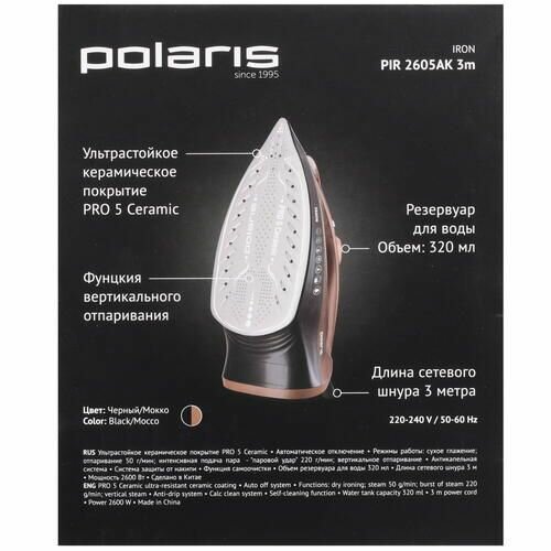 Sole material: ceramics, power: 2600 W, automatic shut-off, additional functions: automatic steam adjustment, steam boost, constant steam supply, dry ironing, vertical steaming, consumption at