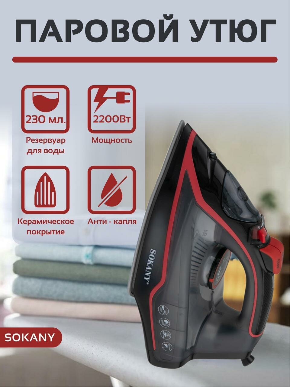 Sole material: ceramic, power: 2200 W, additional functions: steam boost, constant steam supply, self-cleaning system, dry ironing, spray function, vertical steaming, special features: ball fastening