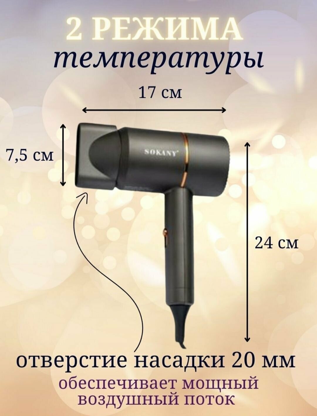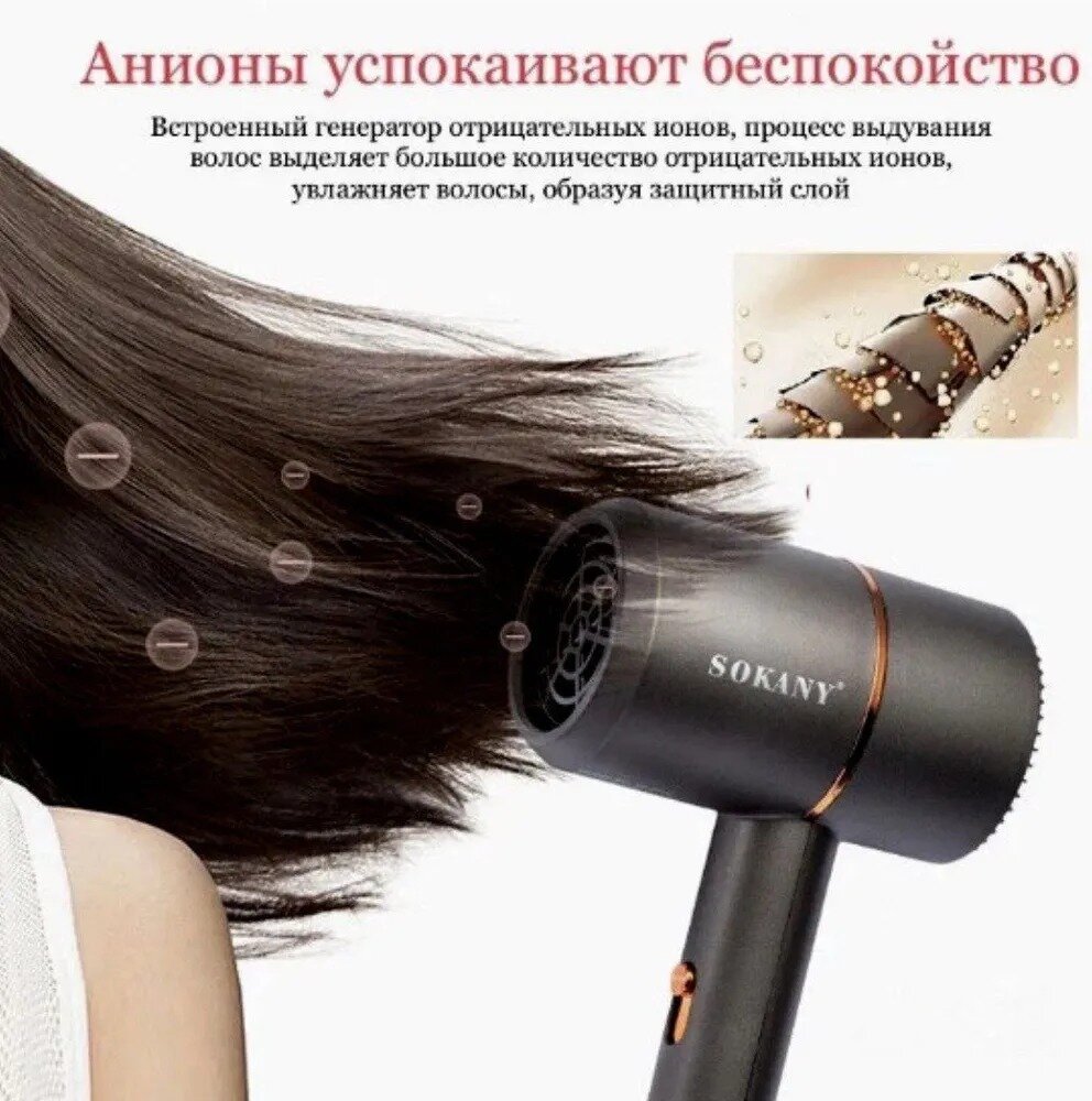 Type: hair dryer, hair dryer power: 2200 W, additional functions: ionization, independent adjustment of heating and air flow, cold air supply, attachments: diffuser, concentrator, number of heating modes: 3, quantity
