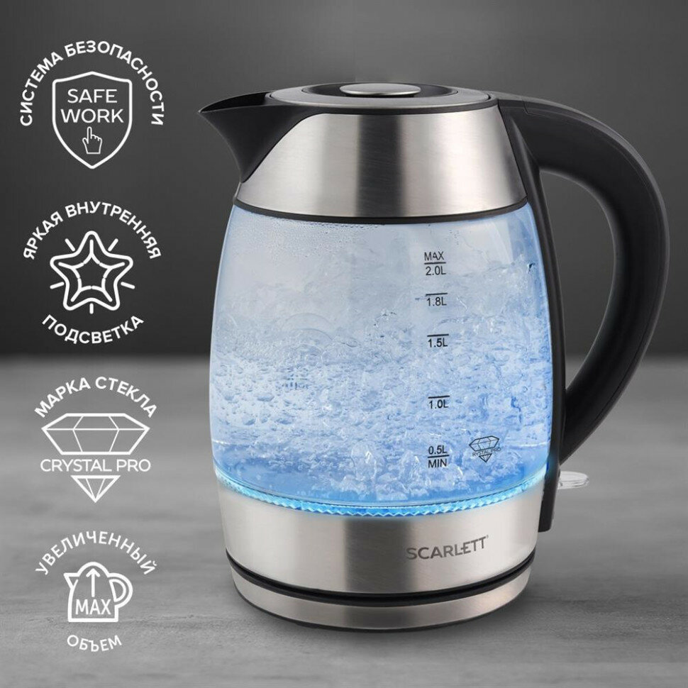 Type: kettle, body material: plastic/glass, volume: 2 l, heating element type: closed, features: 360 degree rotation, water level indicator, power indicator, cord storage compartment, removable lid,