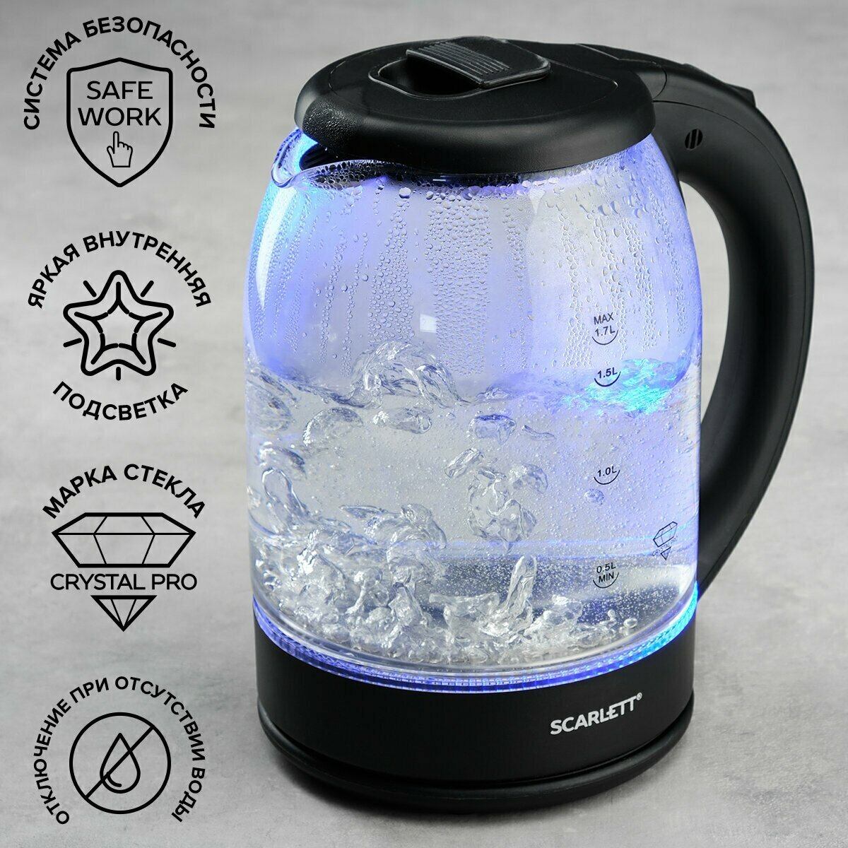Type: kettle, body material: plastic/glass, volume: 1.70 l, type of heating element: closed, features: 360 degree rotation, water level indicator, power on indication, cord storage compartment, filter
