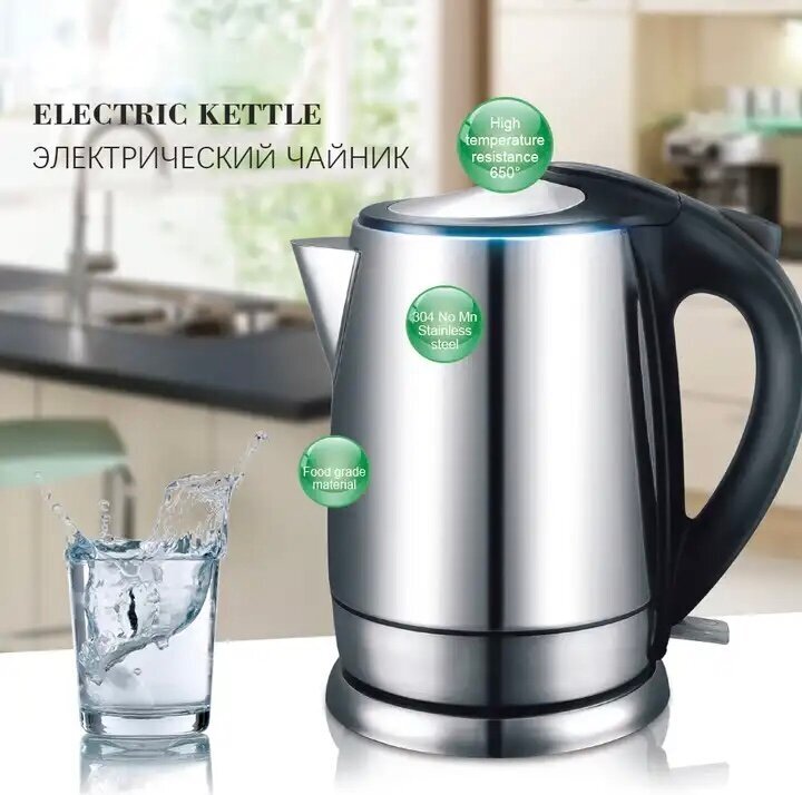 Type: kettle, body material: metal, volume: 1.80 l, heating element type: closed, features: silent boiling, 360 degree rotation, power indicator, cord storage compartment