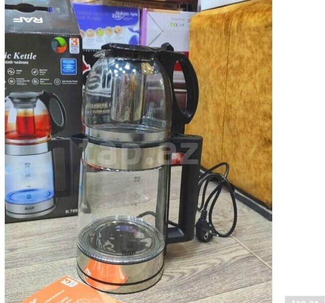 Type: kettle, body material: plastic/glass, volume: 2 l, heating element type: closed, features: silent boiling, 360 degree rotation, teapot, water level indicator, power on indicator
