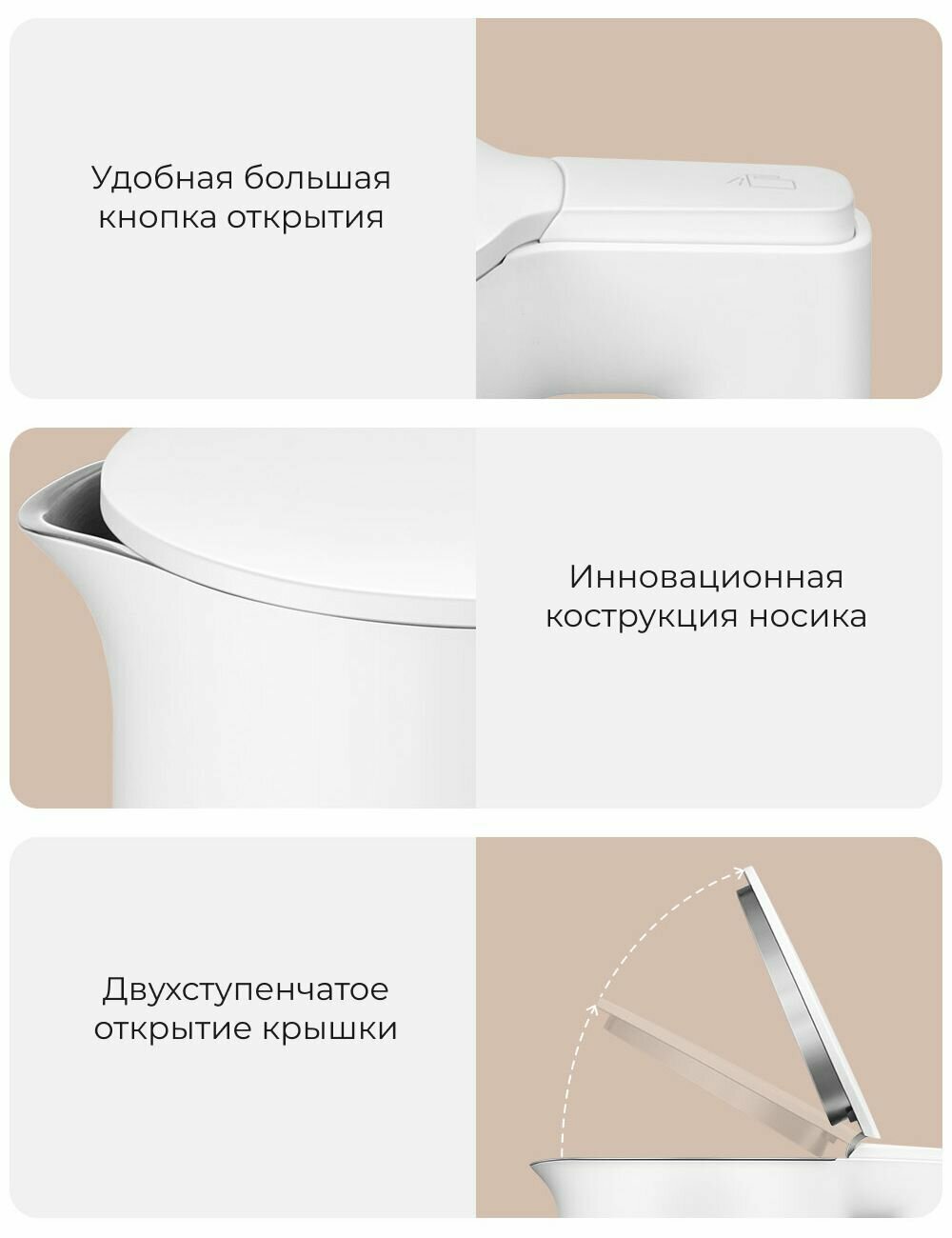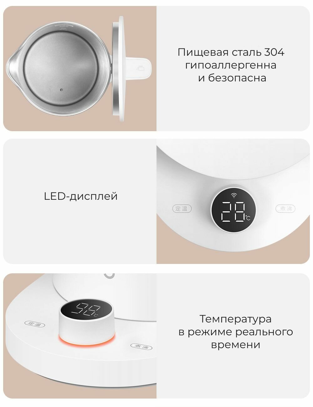Noise level - 45 dB, temperature adjustment accurate to 1°C, 2 boiling modes: for purified water and for tap water, followed by cooling to the desired temperature