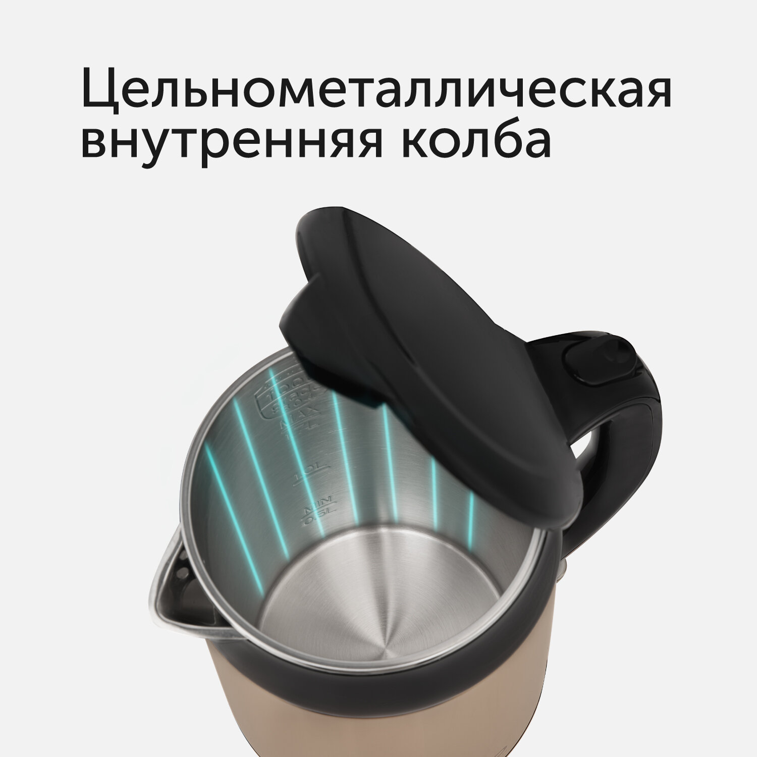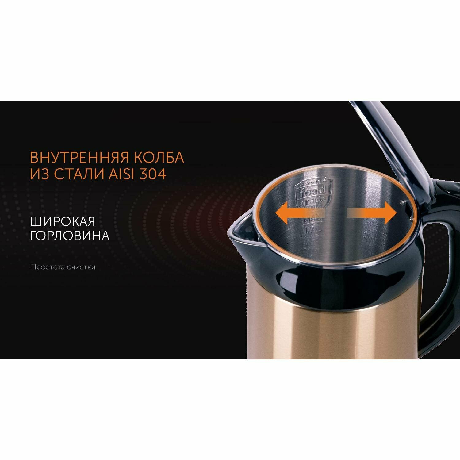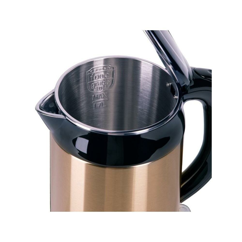 Type: kettle, body material: metal, volume: 1.70 l, heating element type: closed, features: 360 degree rotation, double walls, water level indicator, power indicator, cord storage compartment
