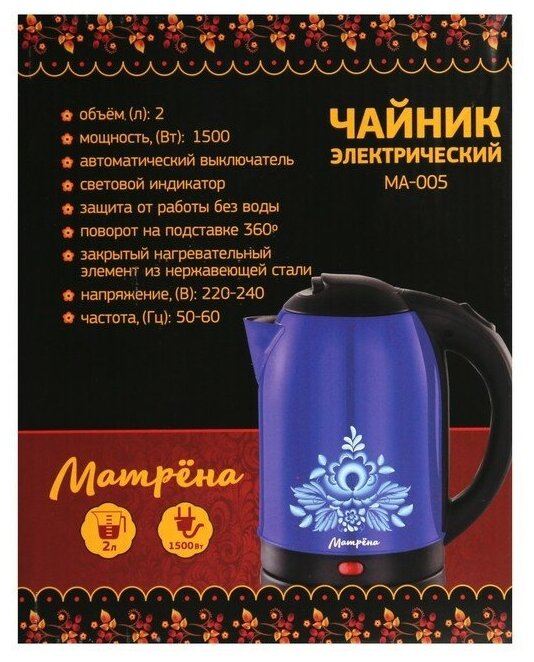 Electric kettle Matryona MA-005, metal, 2 l, 1500 W, blue-black with Gzhel pattern