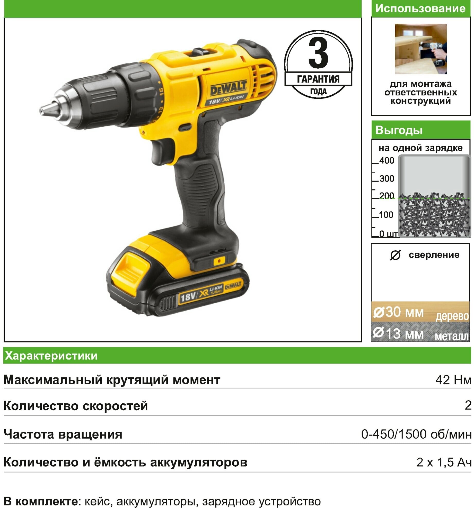 Cordless drill driver DeWalt DCD771S2, 18 V Li-ion 2x1.5 Ah
