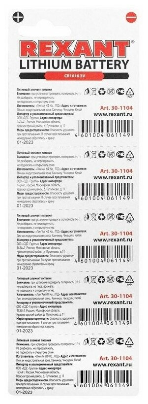 Lithium batteries Rexant 30-1104 CR1616 3V 50 mAh 5 pieces