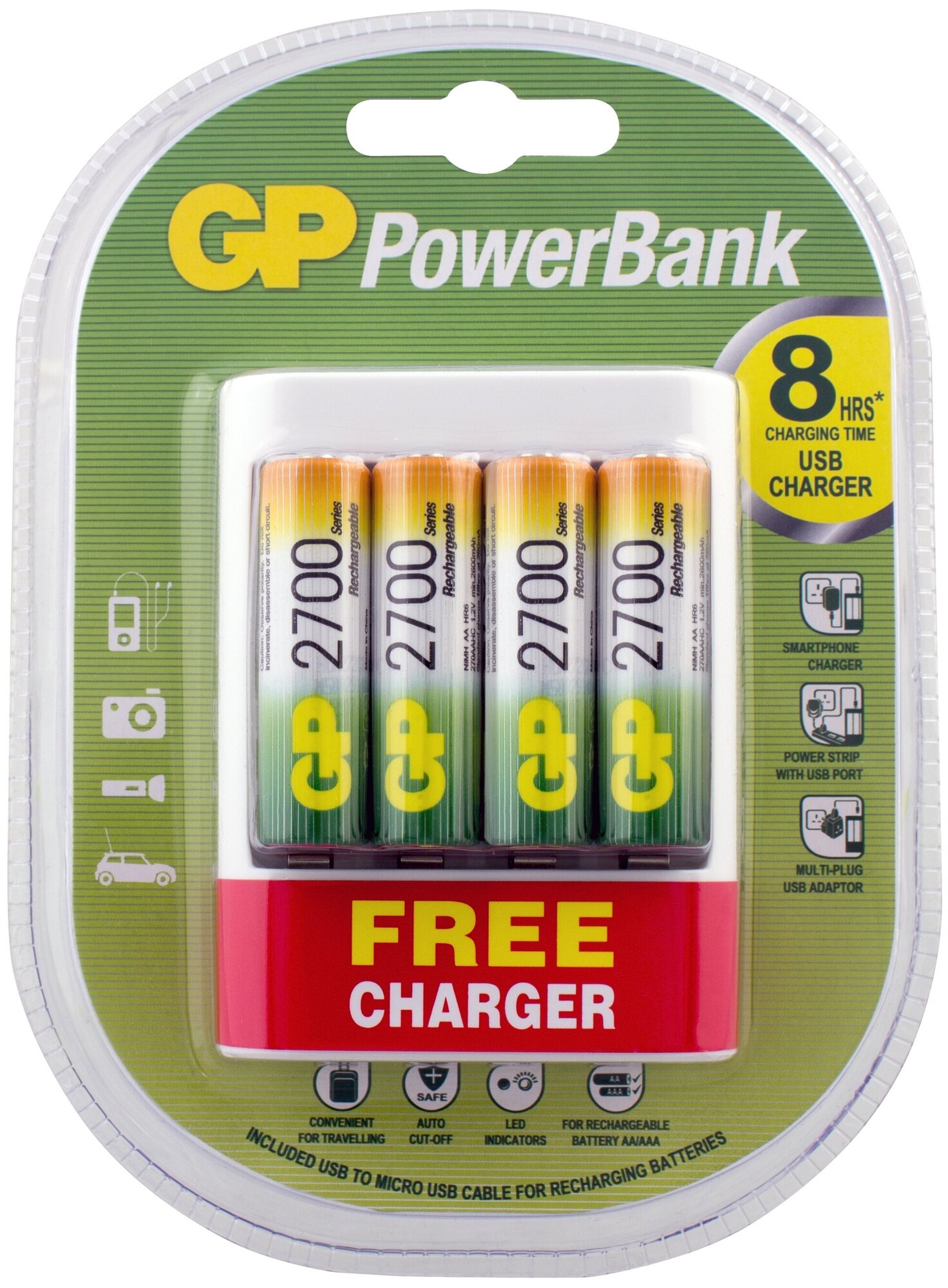 2700mAh Ni-Mh Battery GP Rechargeable 2700 Series AA + USB PowerBank Charger