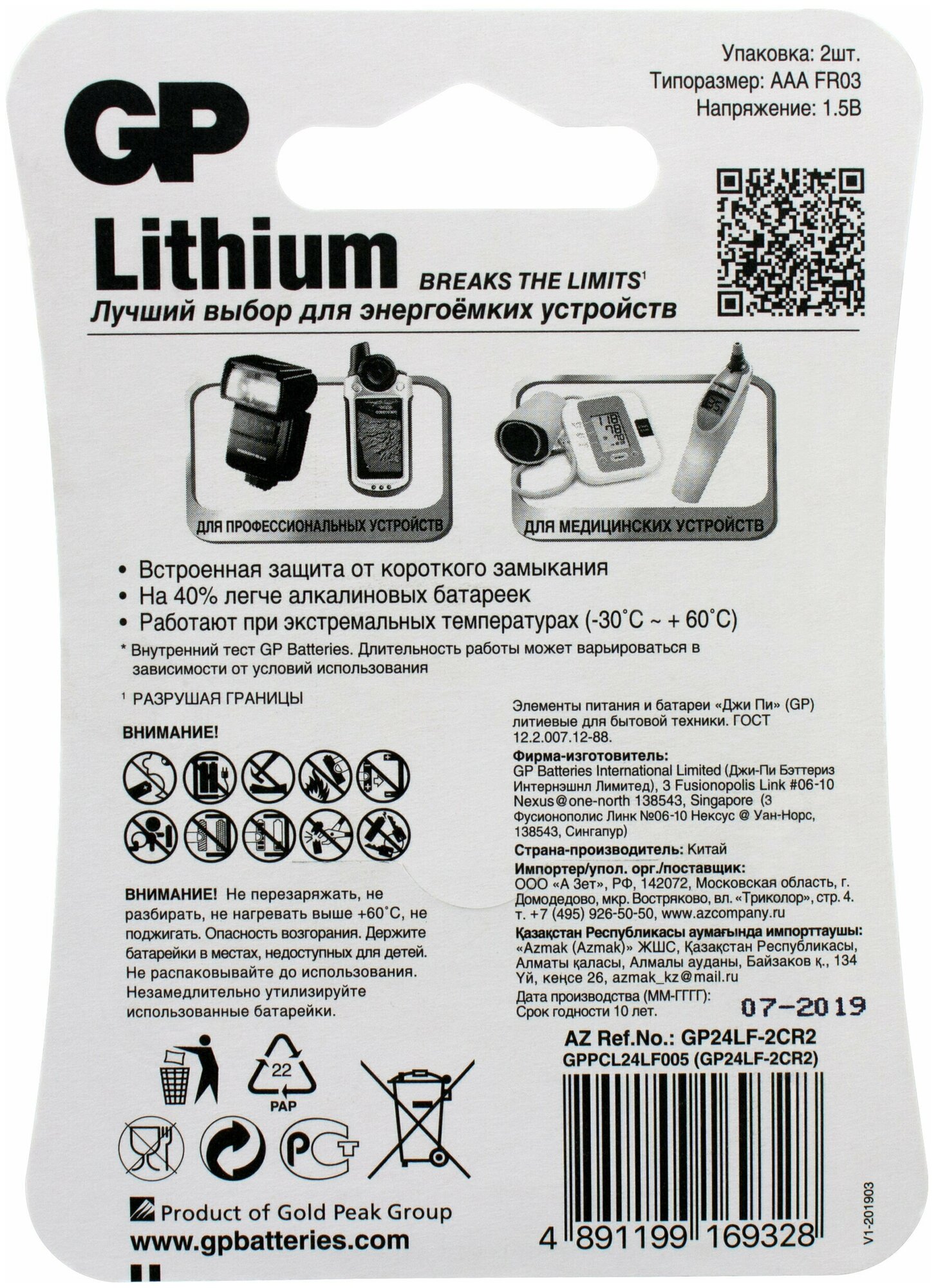 Lithium batteries GP, size AAA LR03, pack of 2// GP 24LF-2CR2
