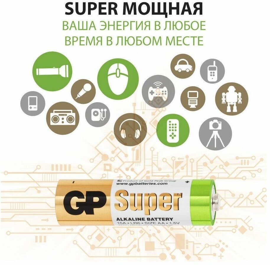 Additional Information: GP Super Alkaline batteries with extended run time. The GP Super Alkaline series is designed specifically for gadgets and electronic devices that need a reliable and powerful power source. AA batteries GP