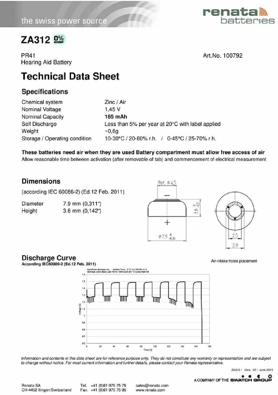 Size : 312 PR41, ZA312, V312A, DA312, technology: zinc air, operating voltage: 1.45 V, capacity: 180 mAh