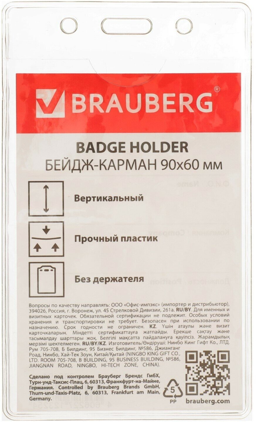 Brauberg Badge pocket vertical 90 x 60 mm, without holder
