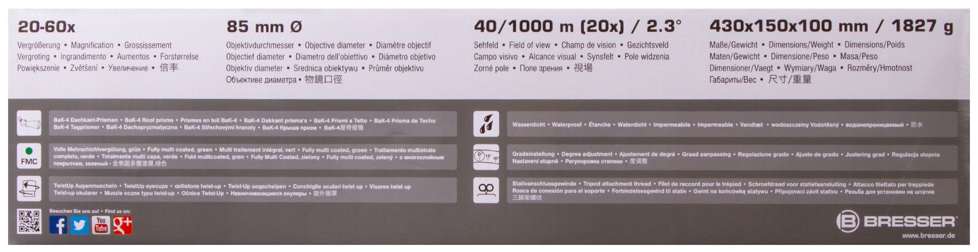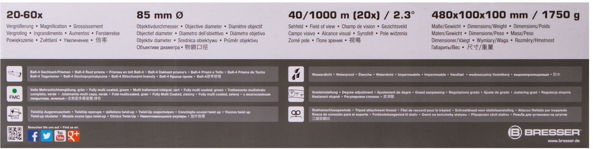 Type: Spotting Scope, Magnification: 60 x, Objective Diameter: 85 mm, Exit Pupil Diameter: 4.25 mm, Functions: Zoom, Features: Case/Pouch Included, Design: Nitrogen/Argon Filling, Water and Dust Resistant, Mount