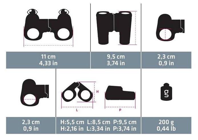 Type: binoculars, magnification: 6 x, lens diameter: 25 mm, functions: pupillary distance adjustment, design: retractable eyecups, rubberized housing, rubber eyecups