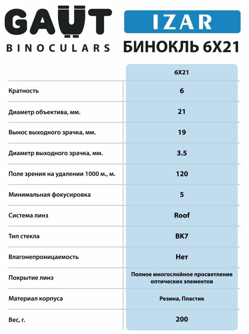 Type: binoculars, magnification: 6 x, objective lens diameter: 21 mm, exit pupil diameter: 3.50 mm, functions: pupillary distance adjustment, features: case/case included, design: multi-coated lenses, rubber