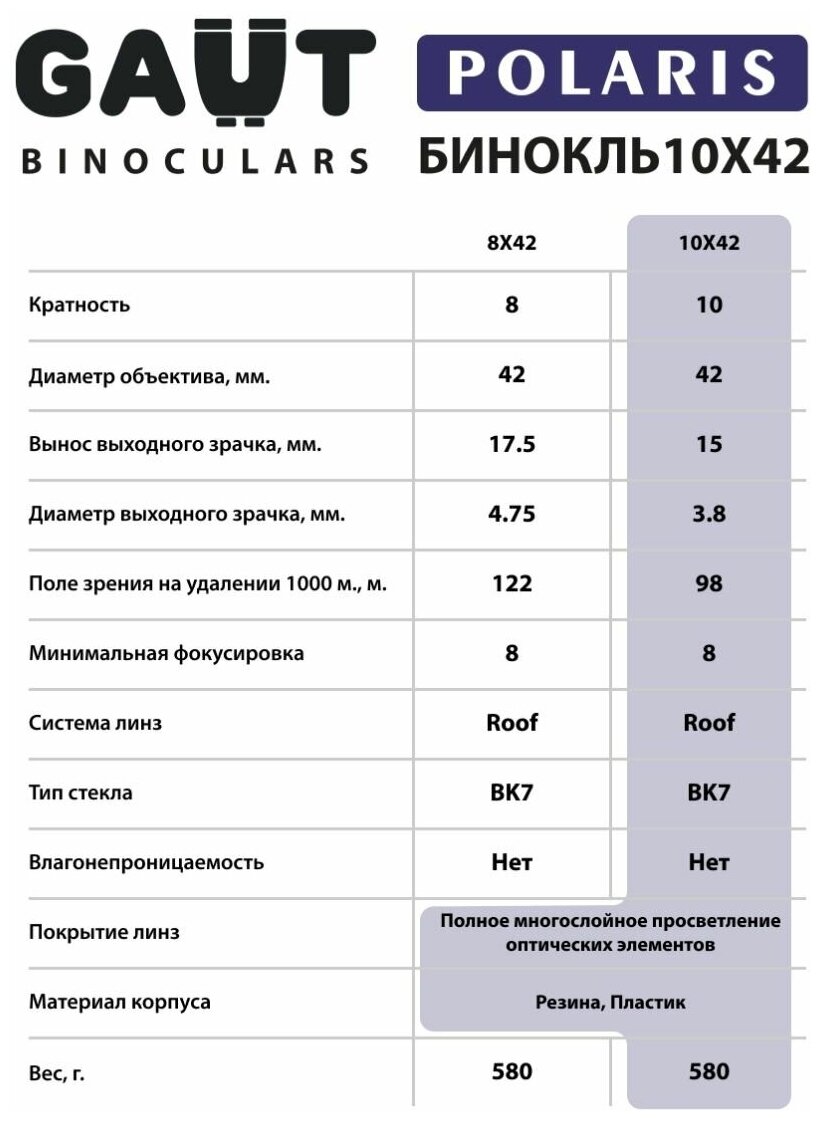 Type: binoculars, magnification: 10 x, lens diameter: 42 mm, exit pupil diameter: 3.80 mm, functions: pupillary distance adjustment, features: case/case included, design: retractable eyecups, protection against