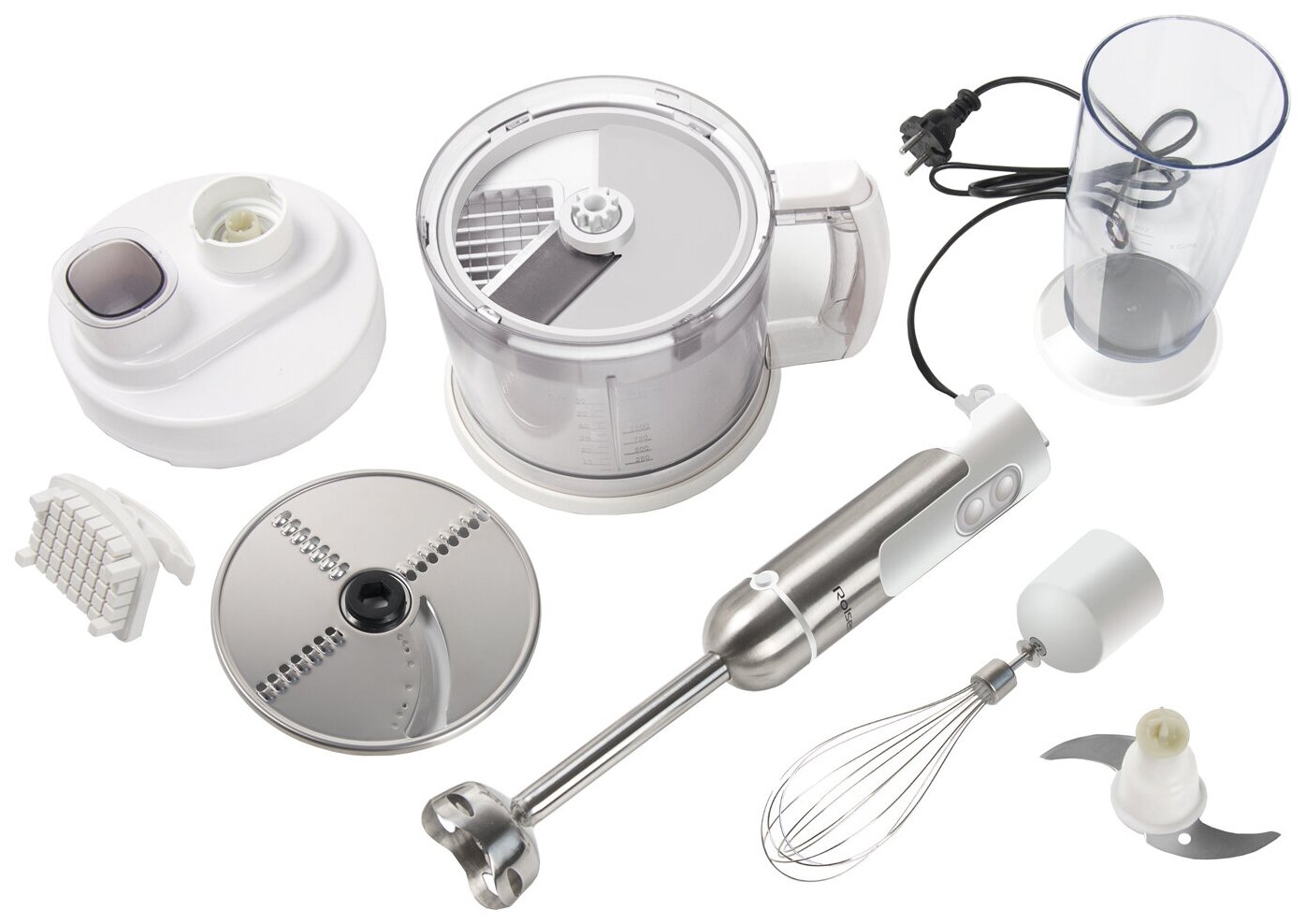Type: submersible, maximum power: 700 W, submersible material: metal, attachments: whisk, slicing disc, dicing, chopper, grater, set includes: measuring cup, add-on