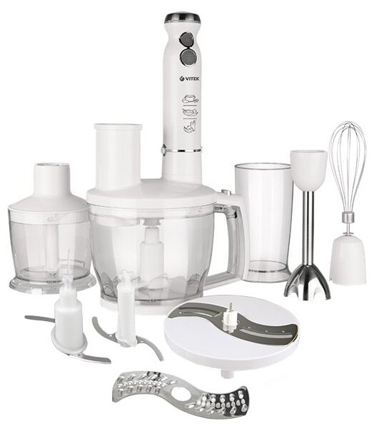 Type: submersible, maximum power: 1000 W, material of the submersible part: metal, attachments: whisk for whipping, for mashing, grinder, included: measuring cup, additional functions: ice pick, smooth speed