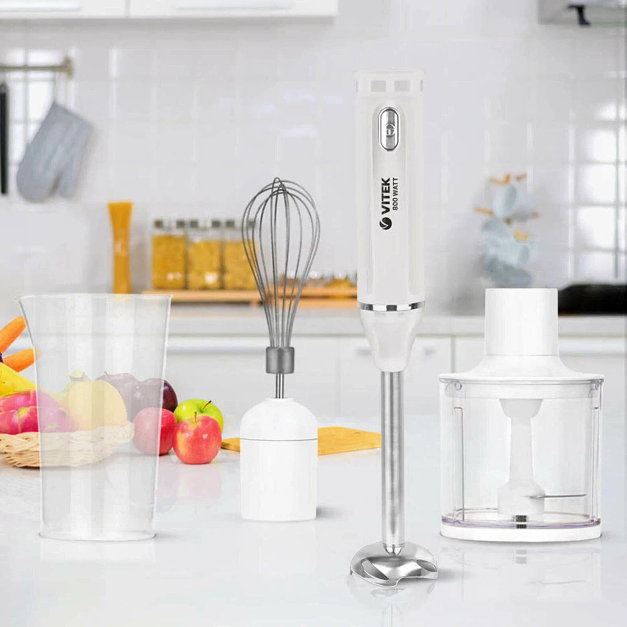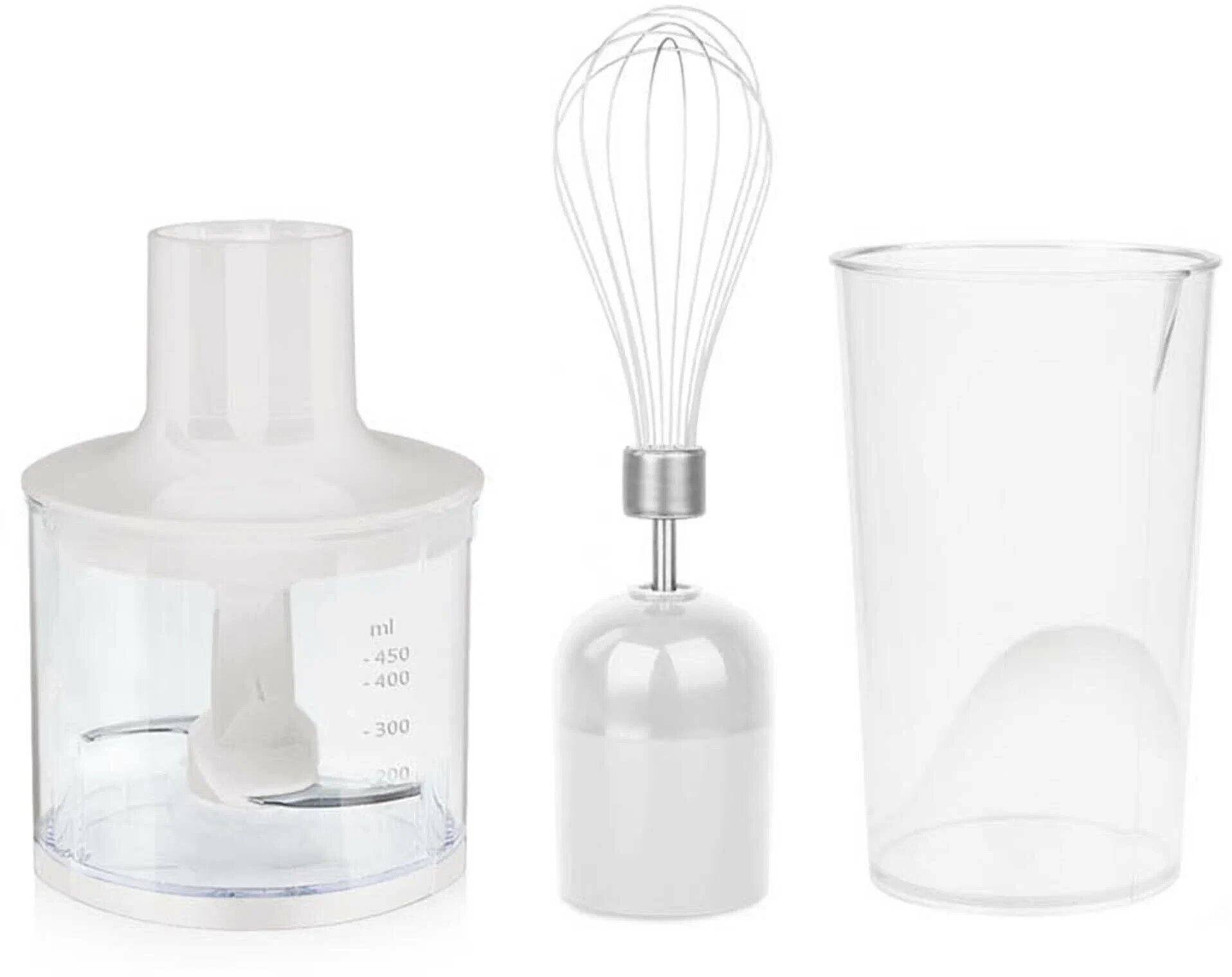 Type: submersible, maximum power: 800 W, material of the submersible part: metal, attachments: whisk, chopper, included: measuring cup, additional functions: smooth speed adjustment, modes: turbo
