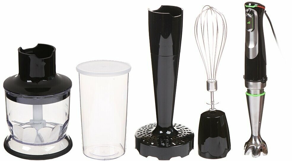 Type: submersible, maximum power: 1000 W, material of the submersible part: metal, nozzles: whisk for whipping, for making puree, chopper, included: measuring cup, additional functions: smooth adjustment