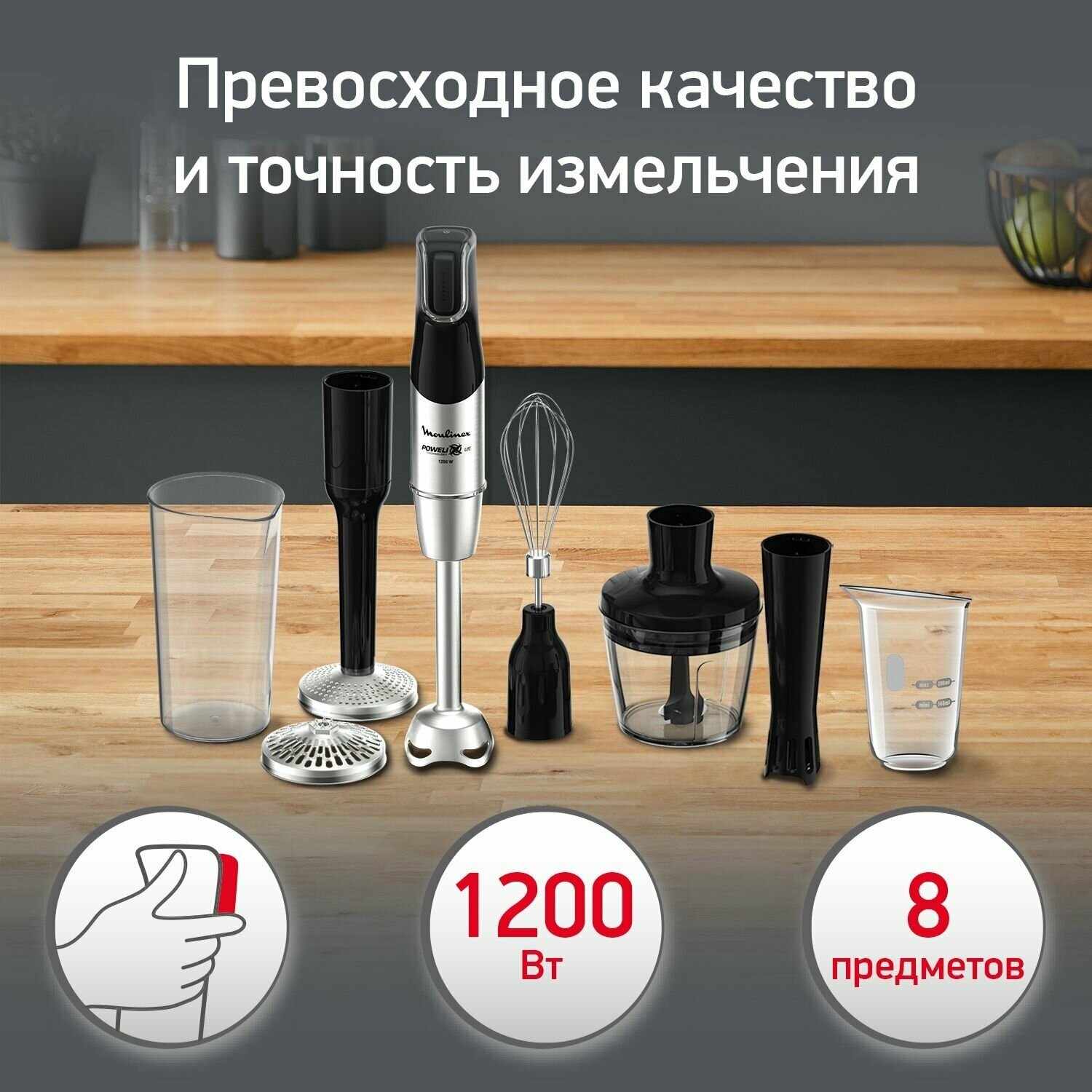 Type: submersible, maximum power: 1200 W, attachments: whisk, chopper, set: measuring cup, modes: pulse, chopper capacity: 0.50 l