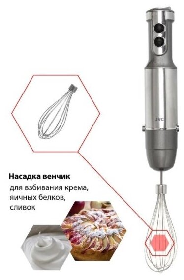 Type: submersible, maximum power: 1000 W, material of the submersible part: metal, attachments: whisk for whipping, for mashing, grinder, included: measuring cup, additional functions: ice pick, smooth speed