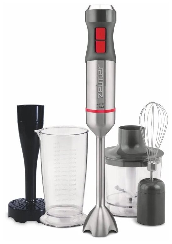 Type: submersible, maximum power: 1400 W, material of the submersible part: metal, material of the jug: plastic, nozzles: whisk for whipping, for making puree, chopper, set includes: measuring cup with a capacity of 700 ml. -