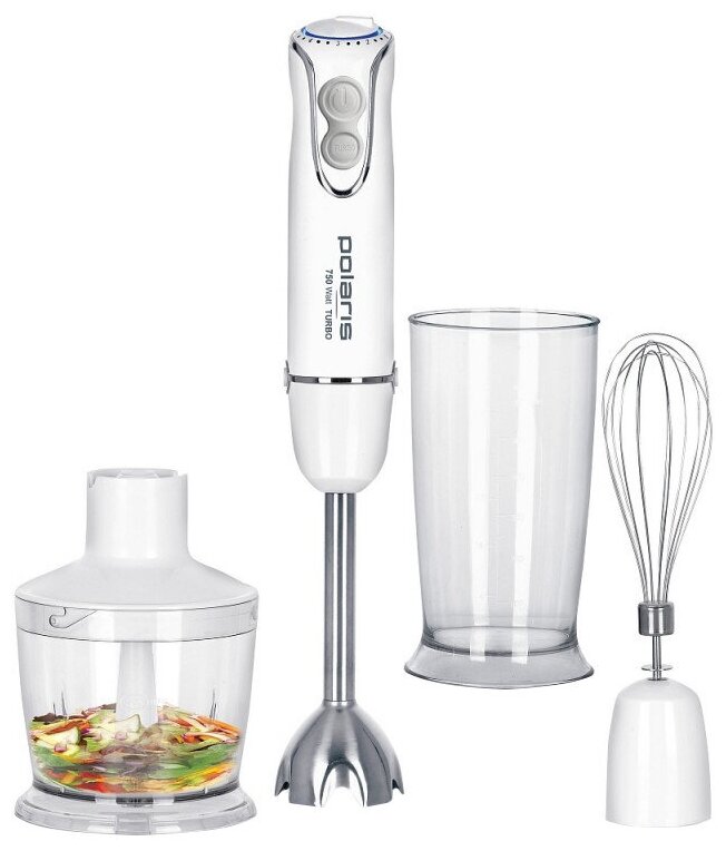 Type: submersible, maximum power: 750 W, submersible part material: metal, attachments: whisk, chopper, set includes: measuring cup, modes: turbo mode, chopper capacity: 0.50 l, number of speeds