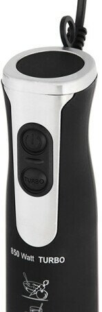 Type: submersible, maximum power: 850 W, material of the submersible part: metal, nozzles: whisk for whipping, for mashing, chopper, set includes: measuring cup, modes: turbo mode, chopper capacity: 0.50