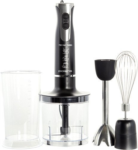 Type: submersible, maximum power: 750 W, submersible material: metal, attachments: whisk, chopper, grater, set includes: measuring cup, modes: turbo mode, chopper capacity: 0.50 l, number of speeds