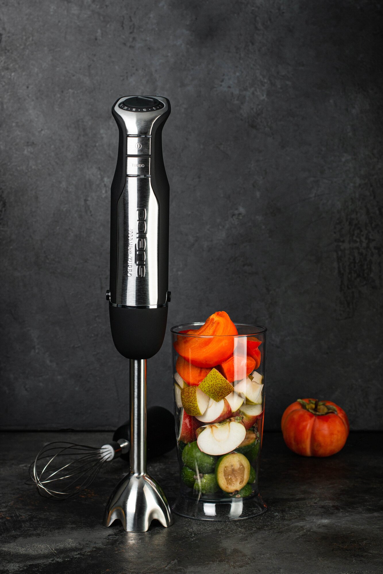 Type: submersible, maximum power: 1000 W, material of the submersible part: metal, attachments: whisk for whipping, for mashing, grinder, included: measuring cup, additional functions: ice pick, smooth speed