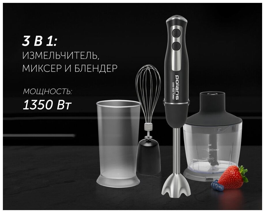 Type: submersible, maximum power: 1000 W, material of the submersible part: metal, attachments: whisk for whipping, for mashing, grinder, included: measuring cup, additional functions: ice pick, smooth speed