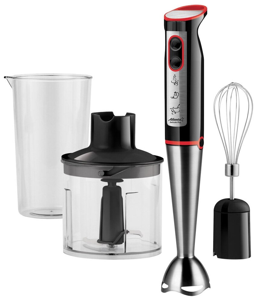 Type: submersible, maximum power: 250 W, material of the submersible part: metal, attachments: whisk, chopper, included: measuring cup, additional functions: stepless speed control, modes: turbo