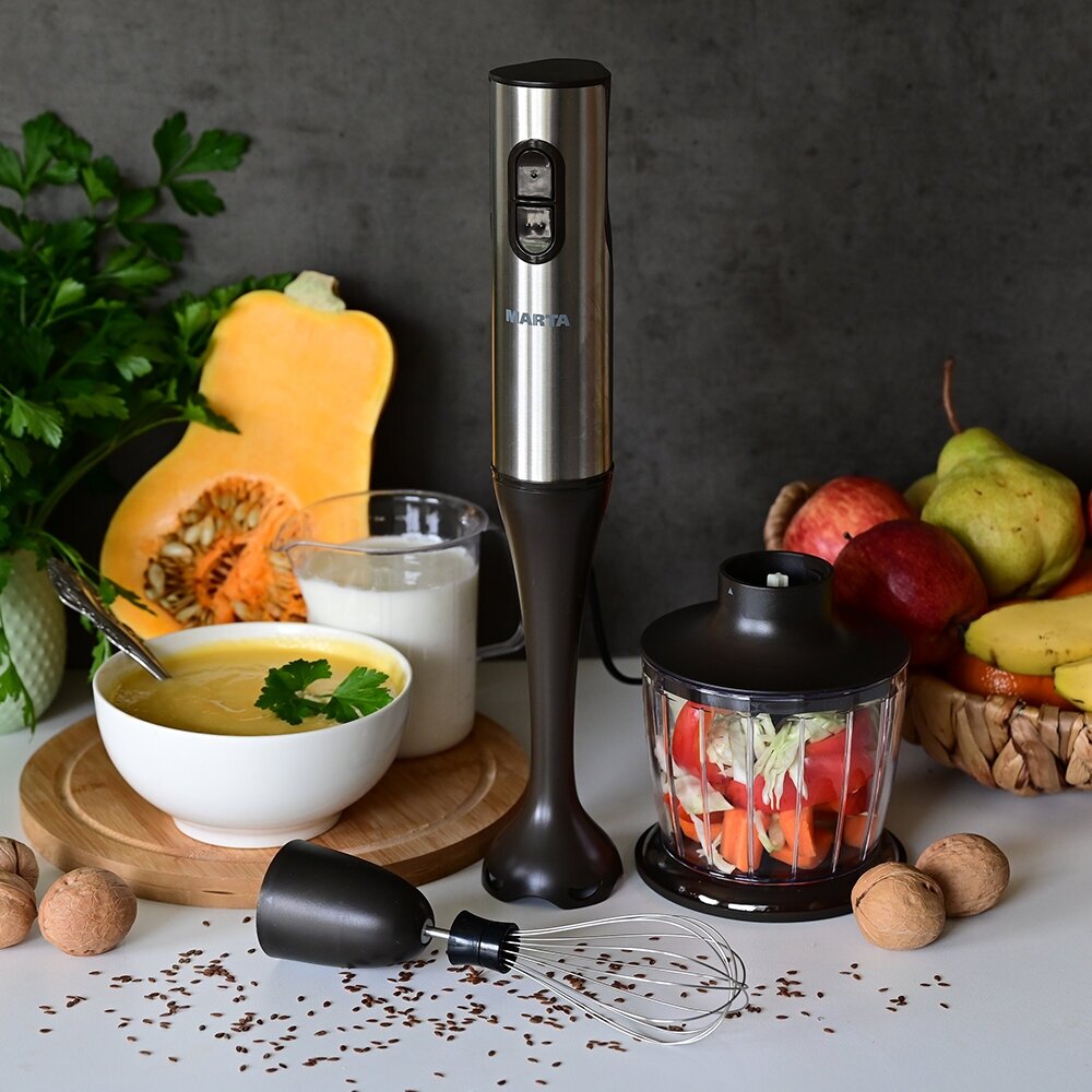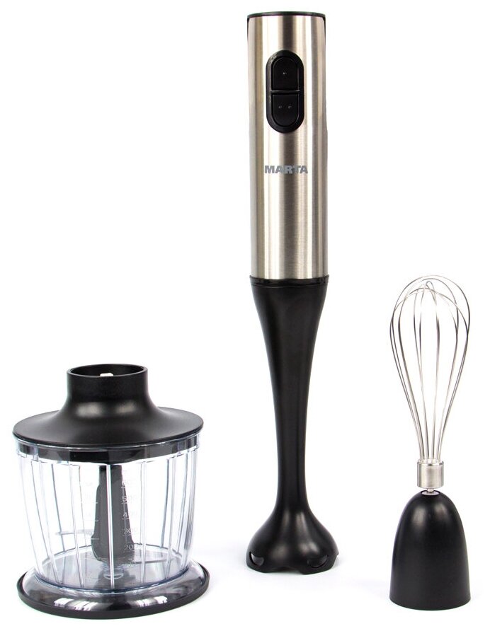 Type: submersible, maximum power: 600 W, attachments: whisk, chopper, grater, chopper capacity: 0.60 l, number of speeds: 2