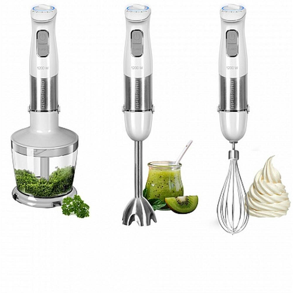 Type: submersible, maximum power: 1000 W, material of the submersible part: metal, attachments: whisk for whipping, for mashing, grinder, included: measuring cup, additional functions: ice pick, smooth speed
