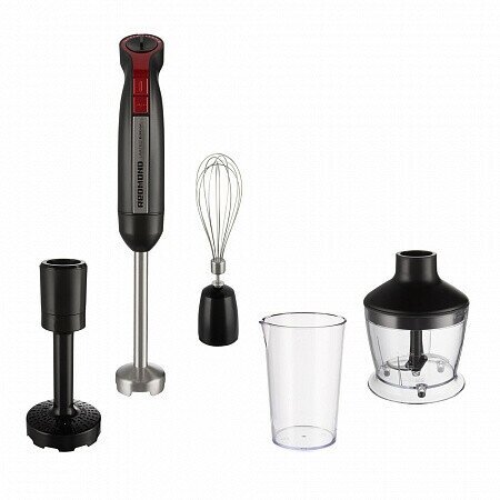 Type: submersible, maximum power: 1200 W, material of the submersible part: metal, nozzles: whisk for whipping, for mashing, chopper, included: measuring cup, additional functions: smooth adjustment