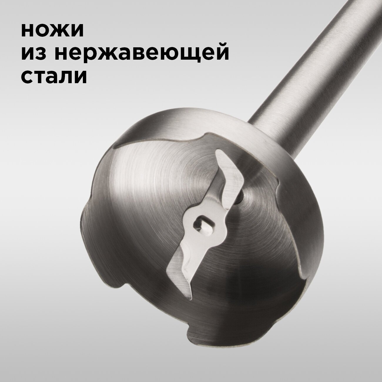 Description: Type: submersible, maximum power: 1000 W, material of the submersible part: metal, attachments: whisk for whipping, for mashing, grinder, included: measuring cup, additional functions: ice pick, smooth speed
