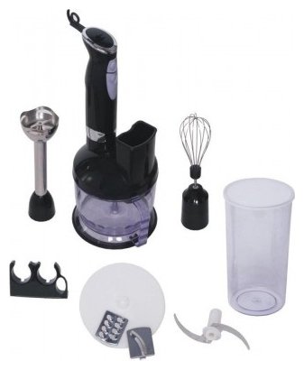 Type: submersible, maximum power: 1000 W, material of the submersible part: metal, attachments: whisk for whipping, for mashing, grinder, included: measuring cup, additional functions: ice pick, smooth speed