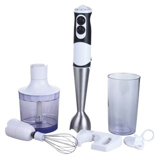 Type: submersible, maximum power: 1000 W, material of the submersible part: metal, attachments: whisk for whipping, for mashing, grinder, included: measuring cup, additional functions: ice pick, smooth speed
