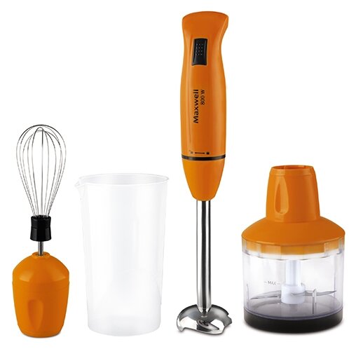 Type: submersible, maximum power: 800 W, material of the submersible part: metal, attachments: whisk, grinder, included: measuring cup, additional functions: stepless speed adjustment