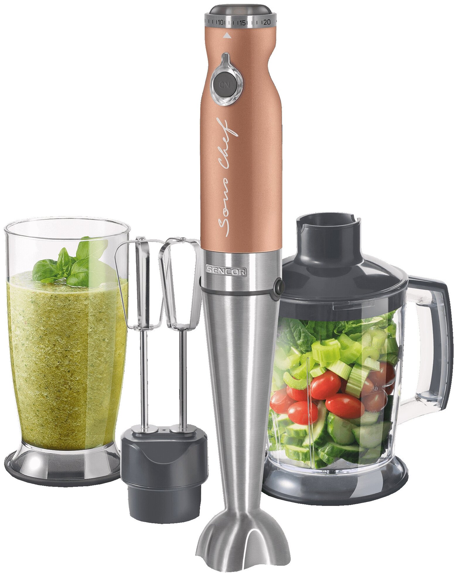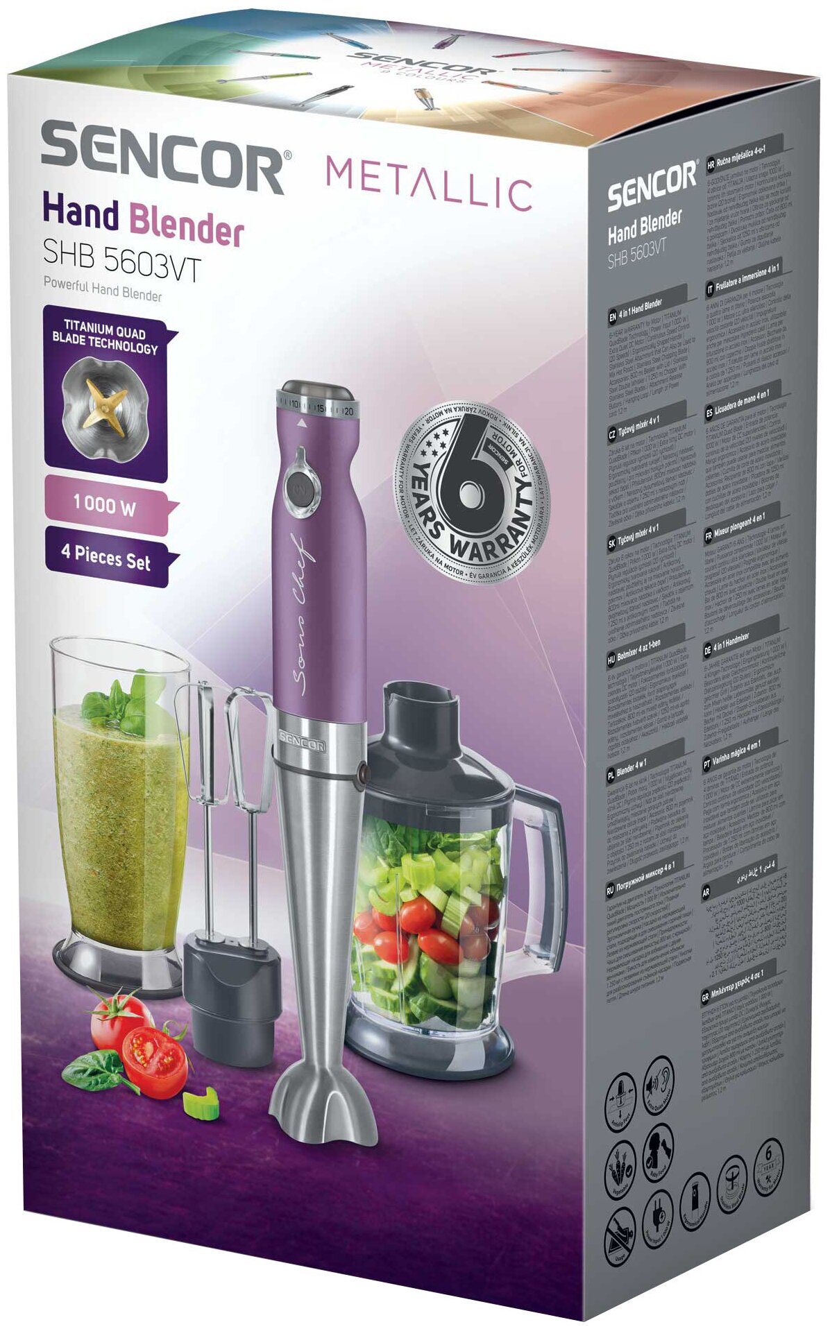 Type: submersible, maximum power: 1000 W, material of the submersible part: metal, attachments: whisk for whipping, for mashing, grinder, included: measuring cup, additional functions: ice pick, smooth speed