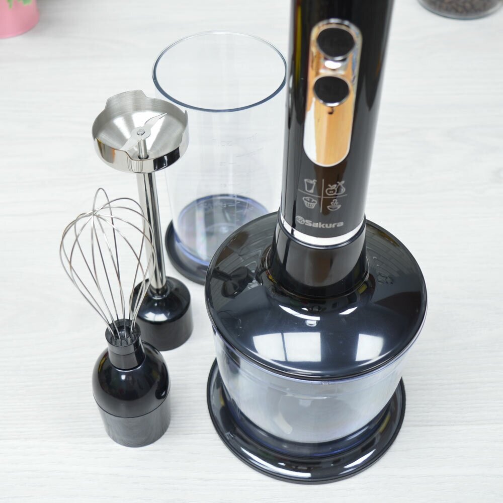 Type: submersible, maximum power: 600 W, submersible material: metal, jug material: plastic, nozzles: whisk, chopper, blender nozzle, set includes: measuring cup, chopper, container made of