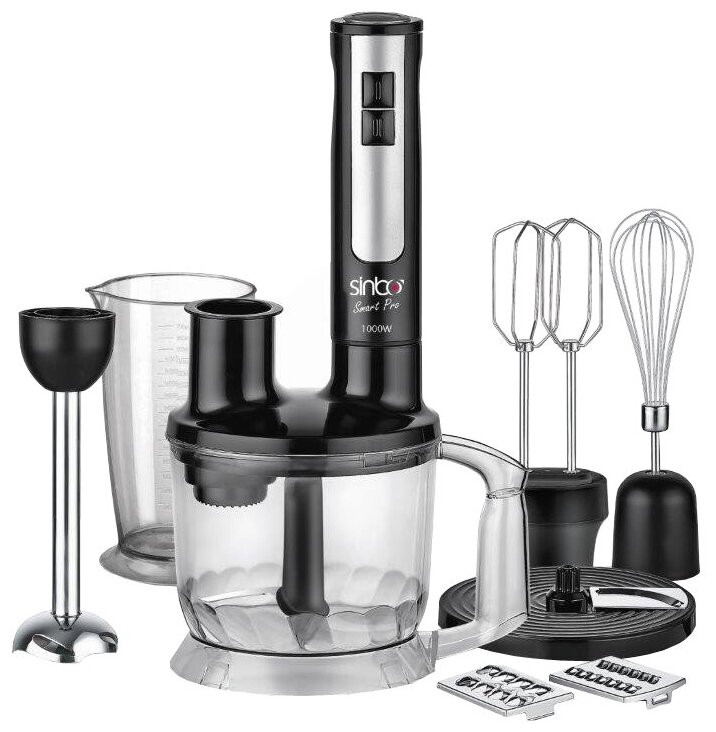 Type: submersible, maximum power: 750 W, material of the submersible part: metal, nozzles: whisk for whipping, slicing disc, chopper, grater, included: measuring cup, number of speeds: 2, especially